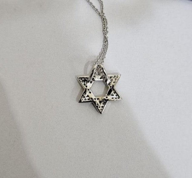 Sterling silver star of david CZ pendant with rhodium plating. Its dimensions are 0.83 inch height and 0.67 inch width.